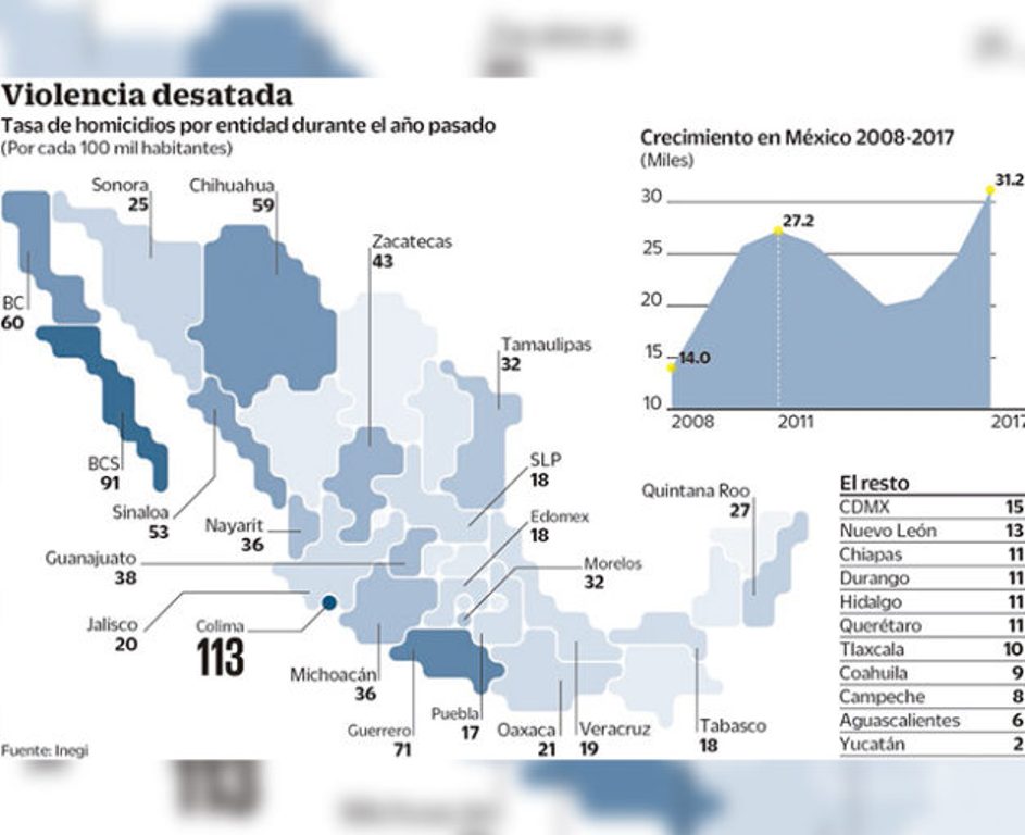 INEGI: EN COLIMA 113 HOMICIDIOS POR CADA 100 MIL HABITANTES, EN 2017