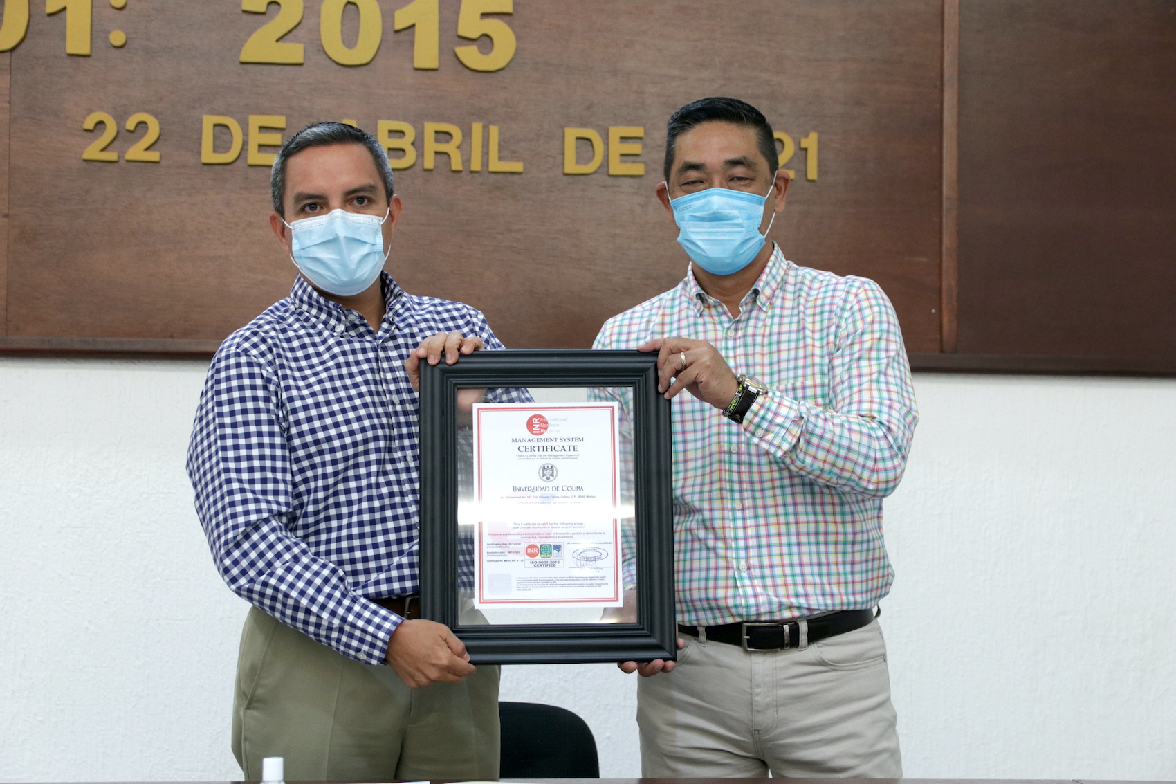 El rector Christian Torres Ortiz Zermeño recibió el certificado enmarcado de manos del director general de la empresa INR, Antonio Hiroshi Ootagaki y además se entregaron certificados a 26 dependencias universitarias de las delegaciones Colima, Villa de Álvarez, Coquimatlán, Tecomán y Manzanillo, por los 33 procesos que obtuvieron la recertificación ISO 9001:2015, así como nombramientos a las y los nuevos integrantes del Comité del Sistema de Gestión Integral y al representante institucional del mismo.