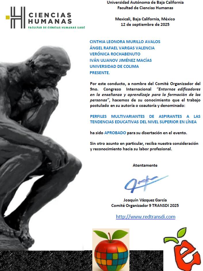 Las y los académicos Cinthia Leonora Murillo Ávalos, Ángel Rafael Vargas Valencia, Verónica Rocha Benuto e Iván Ulianov Jiménez Macías, de la Universidad de Colima, participaron en el 9º Congreso Internacional de Educación y Transdisciplina, celebrado del 22 al 24 de octubre de 2025 en la Universidad Autónoma de Baja California (UABC), en Mexicali, bajo el lema “Entornos edificadores en la enseñanza y el aprendizaje para la formación de las personas”.