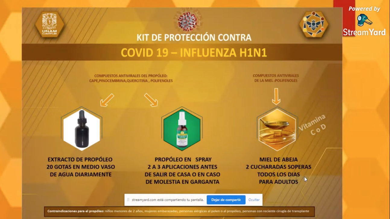 Por lo anterior, recomendó el uso de esta sustancia para prevenir el COVID-19 y la la influenza H1N1: “Extracto de propóleo, 20 gotas en medio vaso de agua diariamente; propóleo en spray, dos a tres aplicaciones antes de salir de casa o en caso de molestia en garganta; y miel de abeja, dos cucharadas soperas, todos los días, para adulto”.