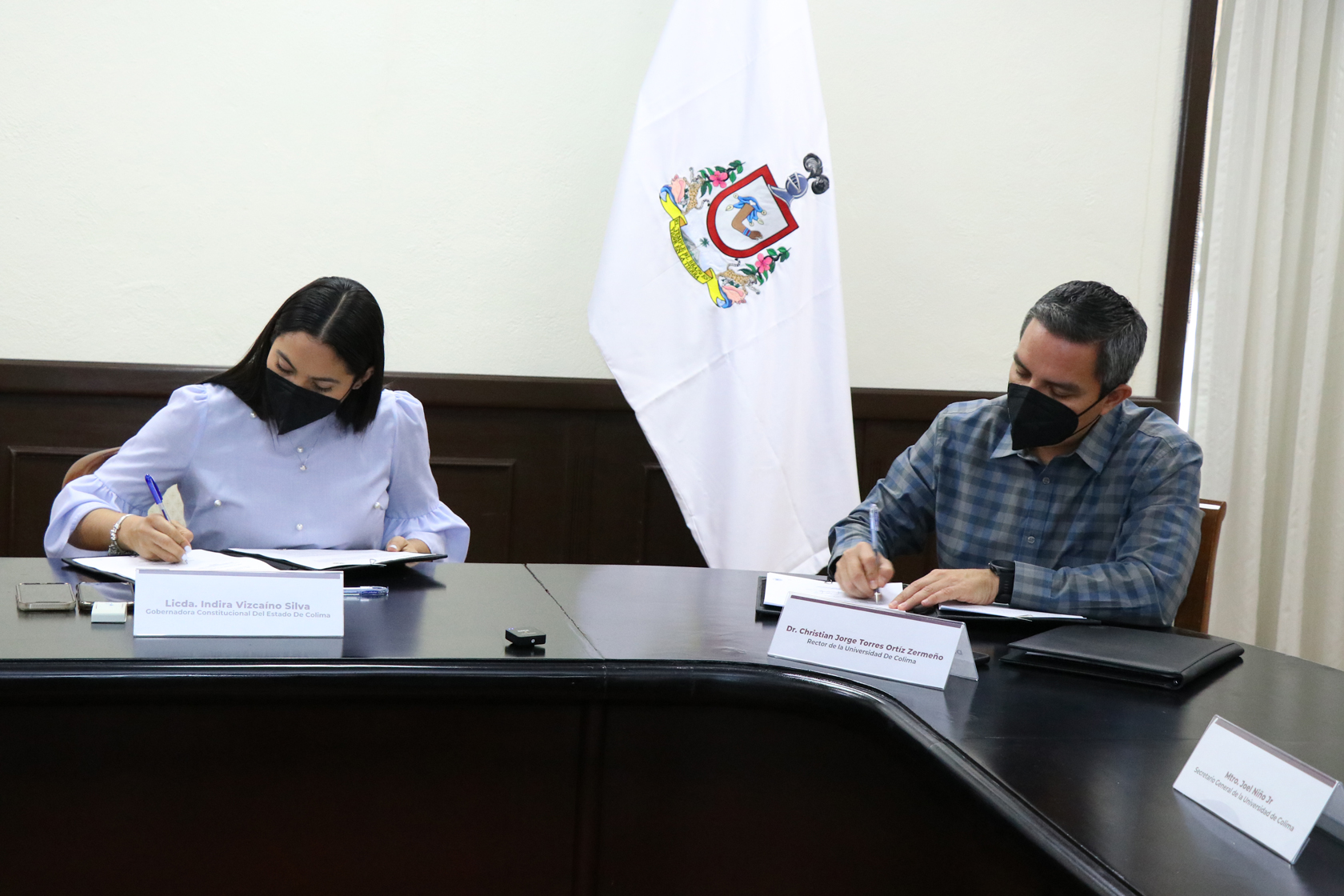 Por el Gobierno del Estado firmó la gobernadora Indira Vizcaíno Silva (como testigo de honor) y por la Universidad el rector, Dr. Christian Jorge Torres Ortiz Zermeño. También firmaron Erik Alberto Gonzalez Sánchez, encargado del Despacho de la Unidad Estatal de Protección Civil y la secretaria general de gobierno, María Guadalupe Solís Ramírez.