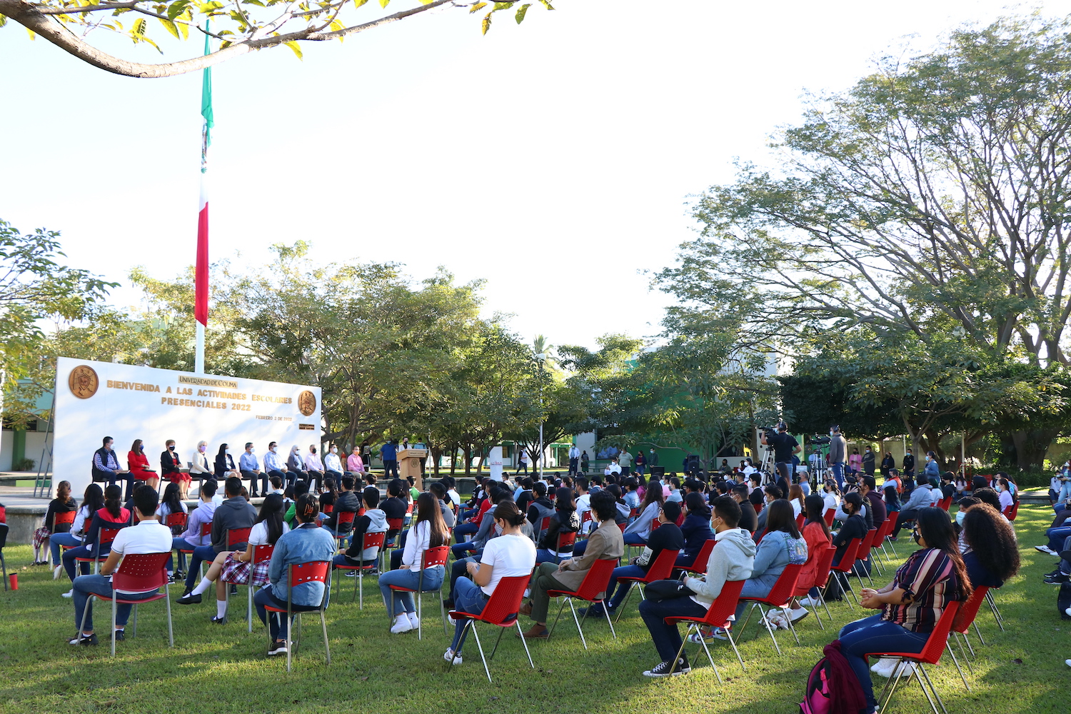 Con la presencia en vivo de estudiantes, docentes, directivos y funcionarios, este miércoles la Universidad de Colima inauguró de manera oficial las actividades escolares presenciales del semestre febrero-agosto de 2022, en una de las explanadas del campus Villa de Álvarez, con una ceremonia que se transmitió por internet a todos los campus y planteles de la institución.