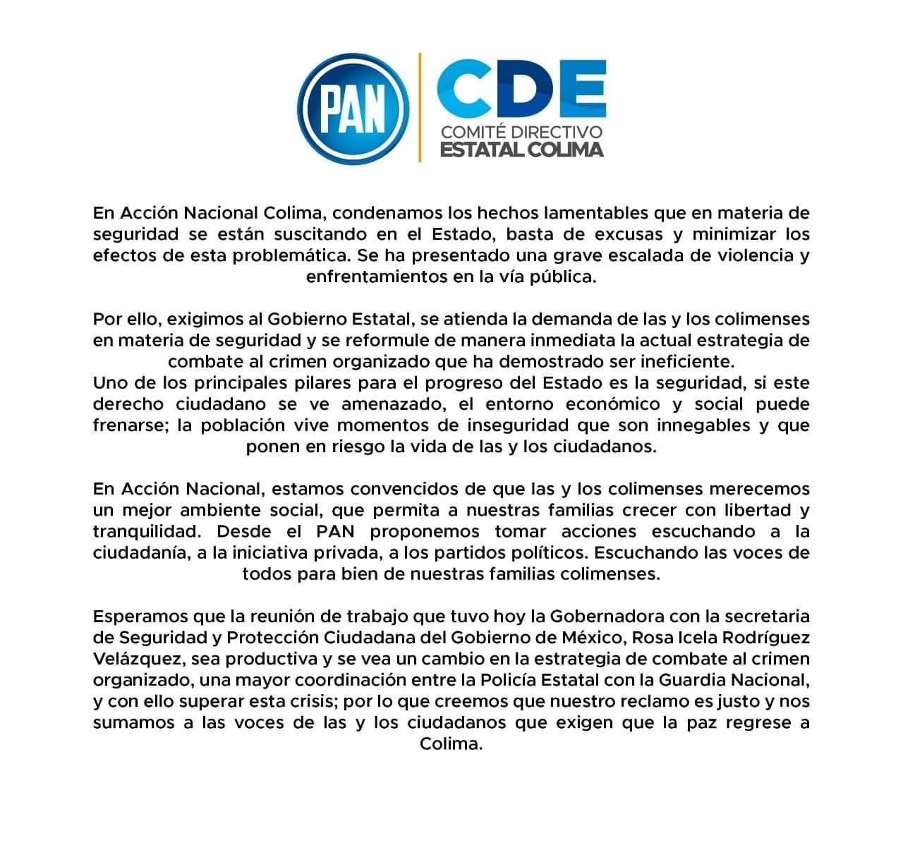 PAN Colima exige se reformule la estrategia estatal de seguridad ante el alza de violencia