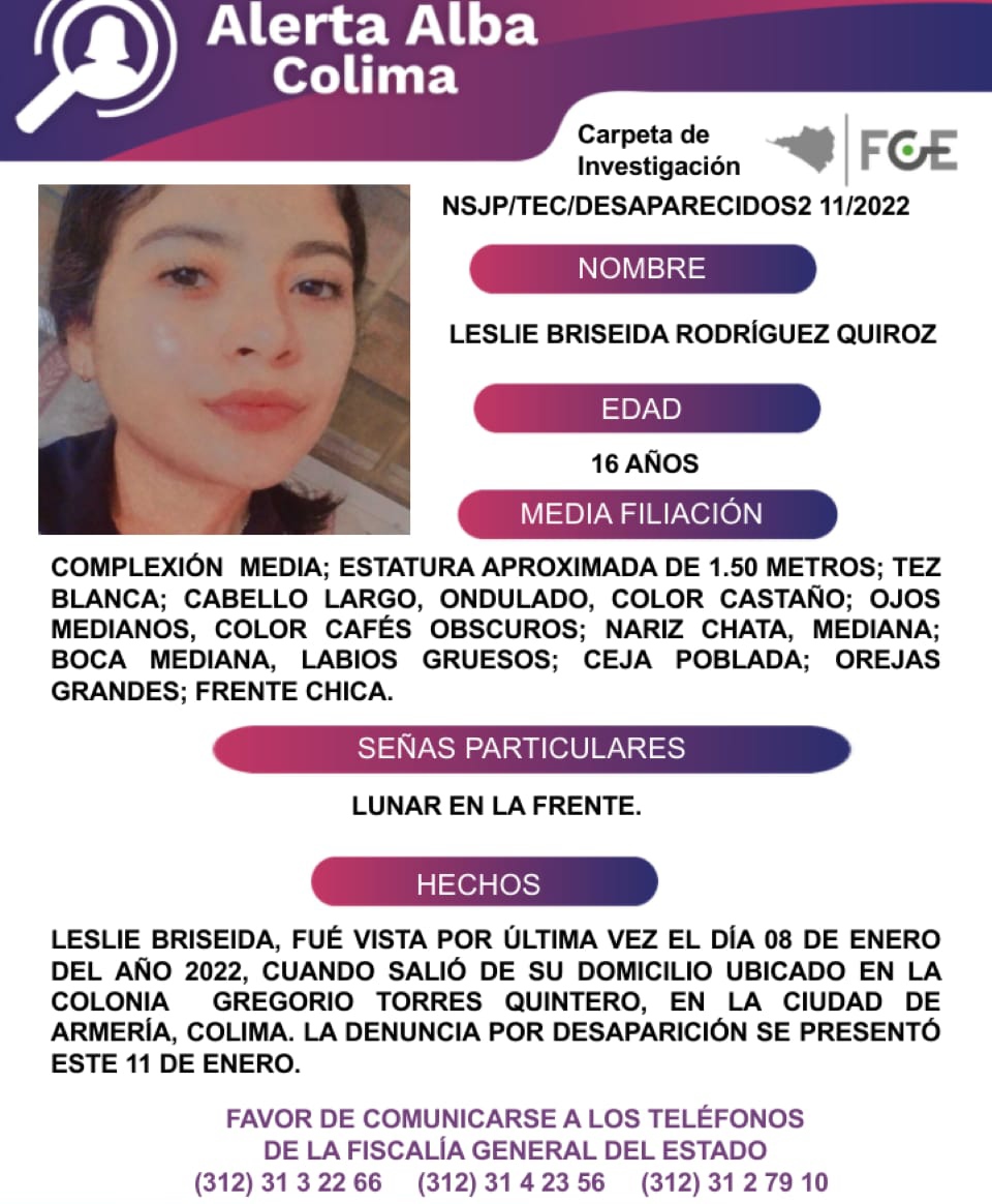 LESLI BRISEIDA, FUE VISTA POR ÚLTIMA VEZ EN ARMERÍA
