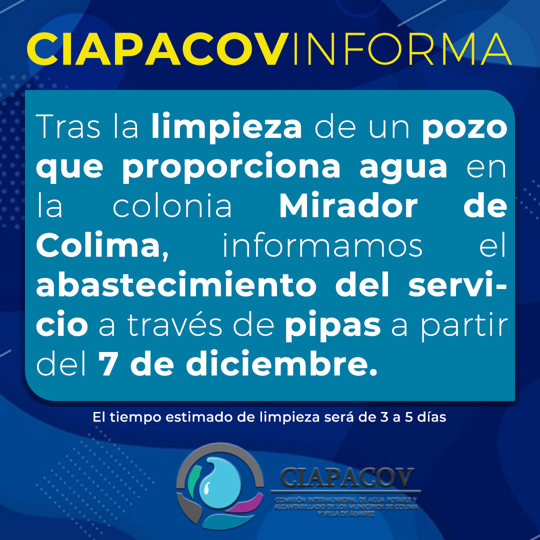Ciapacov informa que se realizará una limpieza al pozo profundo “Mirador de Colima”. Pide a la población tomar precauciones