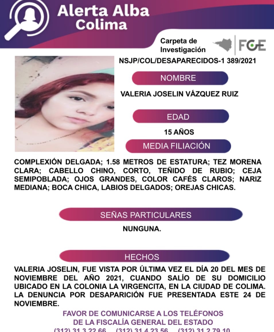 LA ÚLTIMA VEZ QUE VIERON A VALERIA JOSELIN, FUE LA COLONIA VIRGENCITA, EN LA ZONA ORIENTE DE LA CAPITAL COLIMENSE