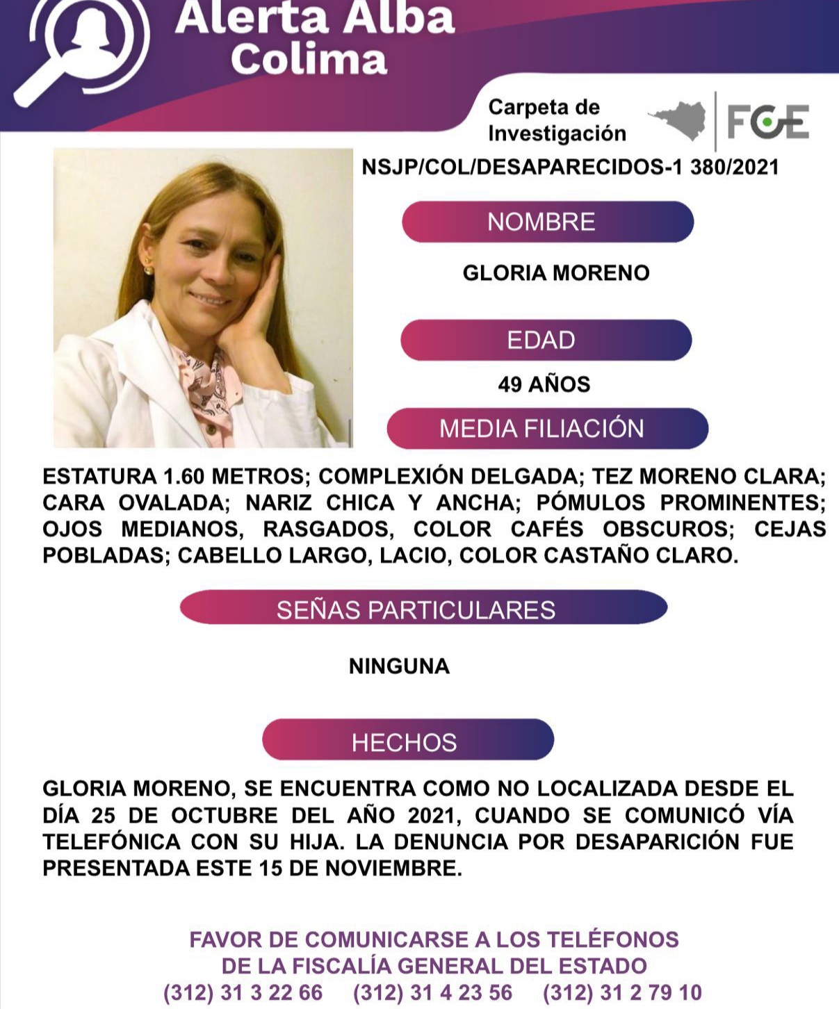 REPORTAN DESAPARECIDA A LA SEÑORA GLORIA MORENO