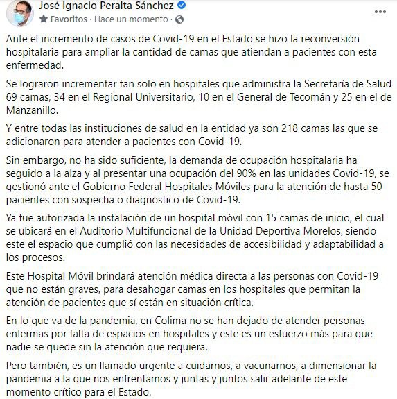 Se realiza reconversión hospitalaria para atender pacientes Covid en Colima: Gobernador