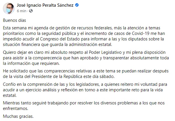 Gobernador no acudirá a comparecencia en el Congreso, pide sea después de la visita de AMLO